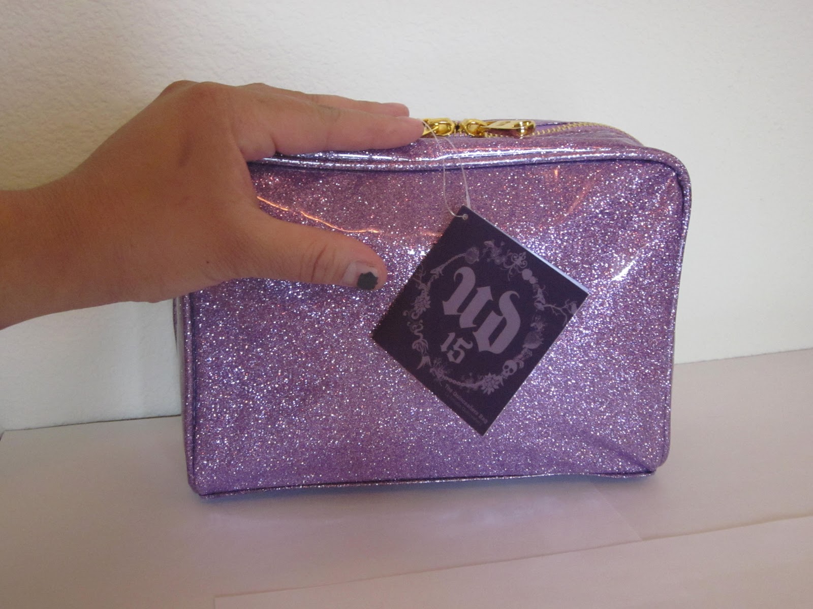It's verrrrry glittery and purple, with a gold zipper and zipper pulls. The zipper pulls have the UD logo on them: